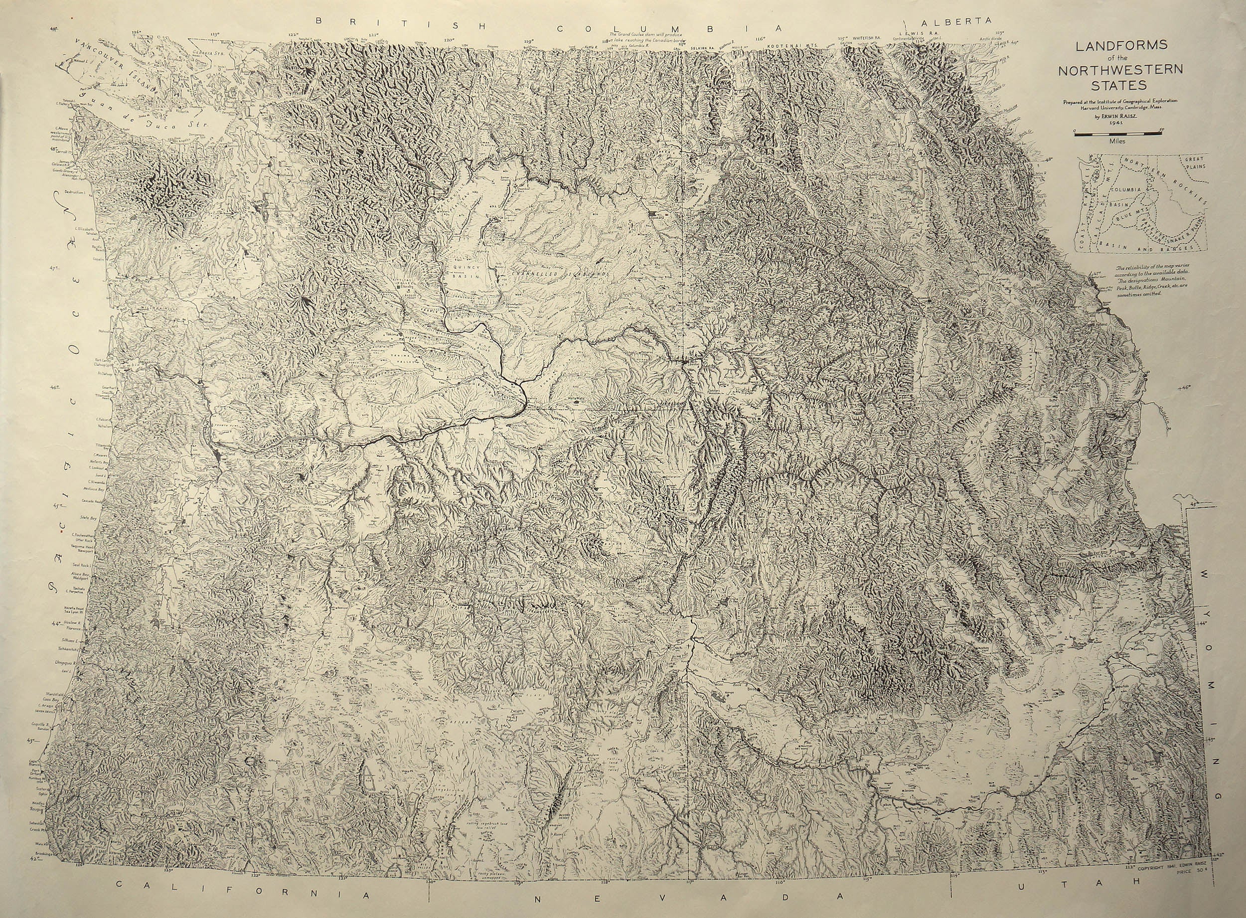 Erwin Raisz was a cartographer and educator that produced hand drawn topographical maps that turned the complexities of terrain into a thing of beauty. Not unlike F.W. Egloffstein a century prior, Raisz made the wild and diverse landscapes of the US West into detailed, intuitively understandable maps that unveiled the area into something visually compelling. This uncommon map of the northern portions of the West spans from western Montana and Idaho, to the coast. Shows land quality, drainages, and placenames, along with state borders.